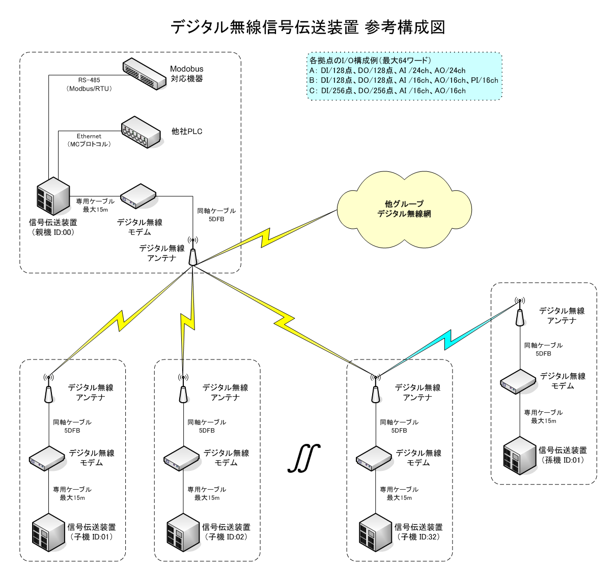 - デジタル無線を使用することにより、ランニングコストの大幅な削減及び回線経由の雷被害を防止するとともに、Modbus/RTUやMCプロトコルに対応し、他社製品との接続性も向上しております。