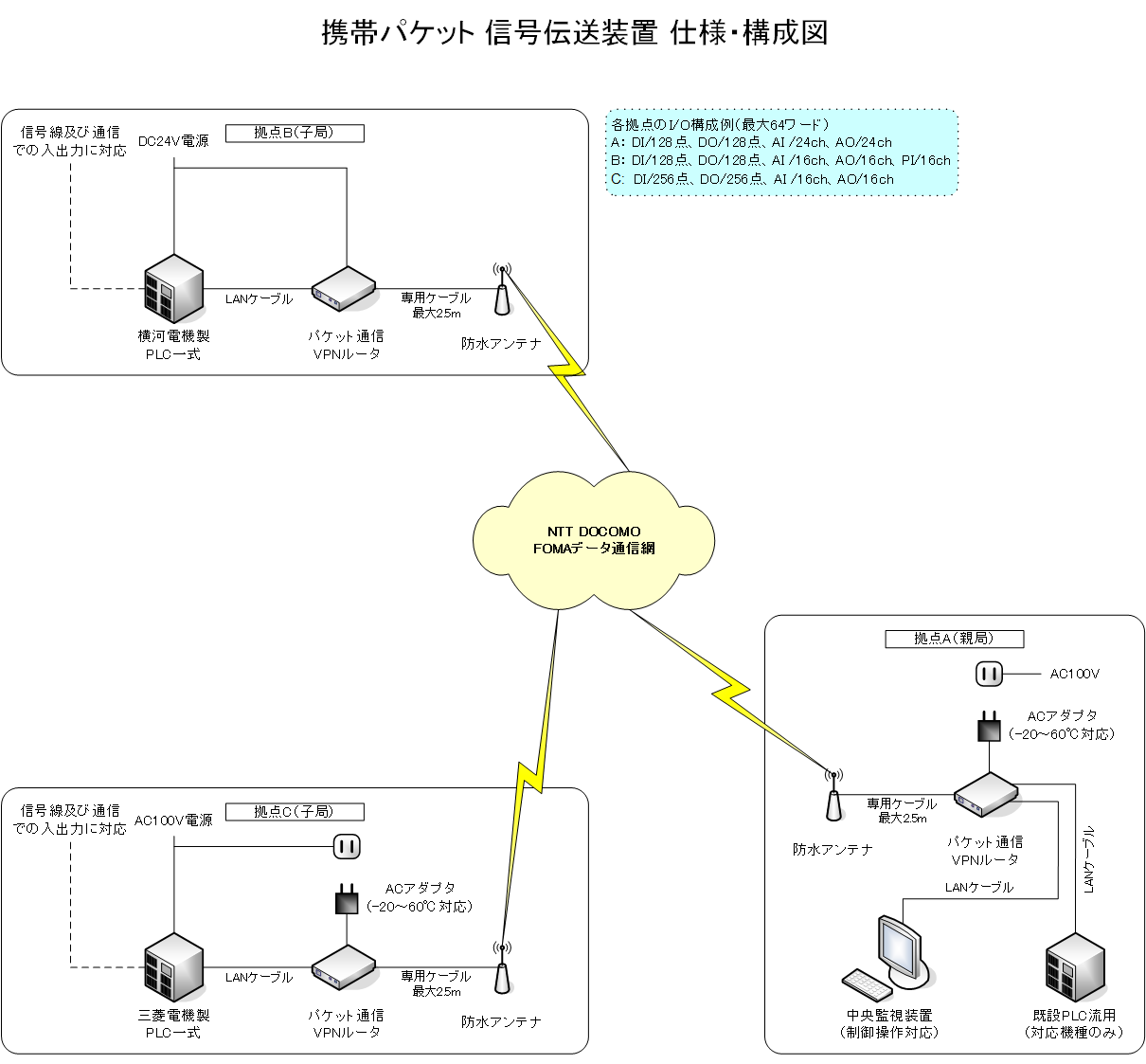 - FOMA通信網を使用することにより、さらに広範囲での通信を可能としながら、従来通り、ランニングコストの削減、回線経由の雷被害防止、Modbus/TCP及びMCプロトコルを使用した他社製品との接続性向上を実現しております。